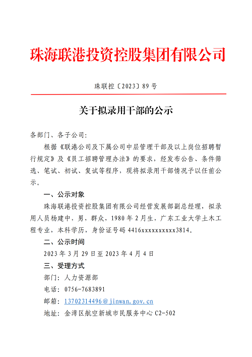 珠聯(lián)控〔2023〕89號 關(guān)于擬錄用干部的公示
