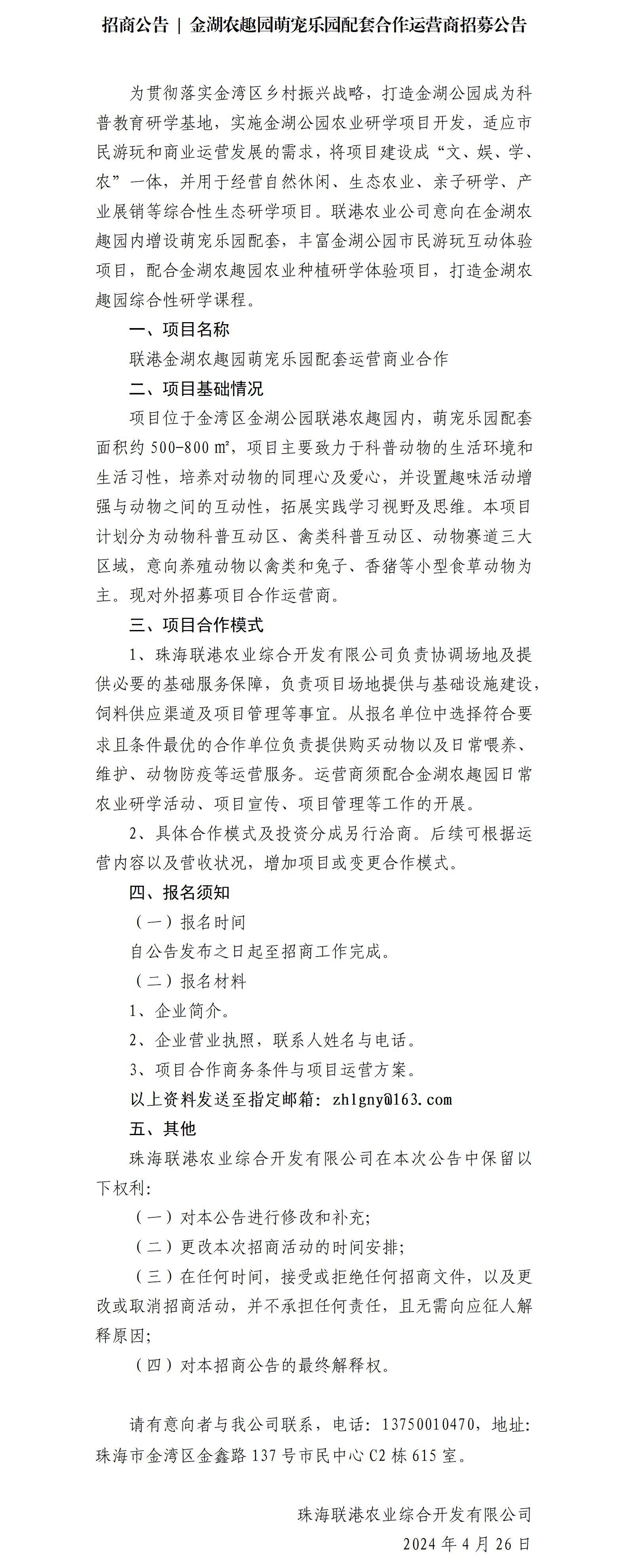 招商公告 | 金湖農(nóng)趣園萌寵樂園配套合作運營商招募公告
