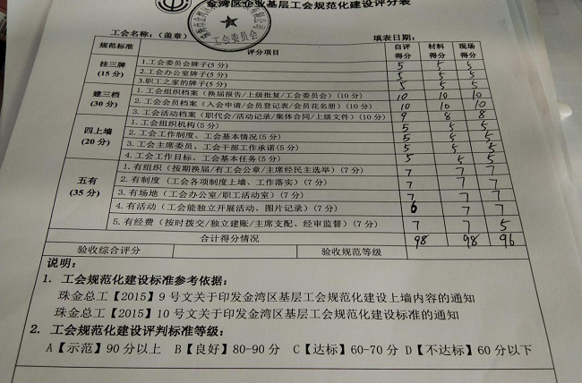 檢查組對照檢查標準對公司工會建設情況進行了現場打分,給予了96分(示范)的高分評價。邱影監(jiān)事長代表公司工會對區(qū)總工會的關心和支持表示感謝,強調公司下一步將繼續(xù)在區(qū)總工會領導下,持續(xù)加強職工之家建設,營造更加溫馨的工作環(huán)境,讓員工真正愛企業(yè)、維護企業(yè),以企業(yè)為家。