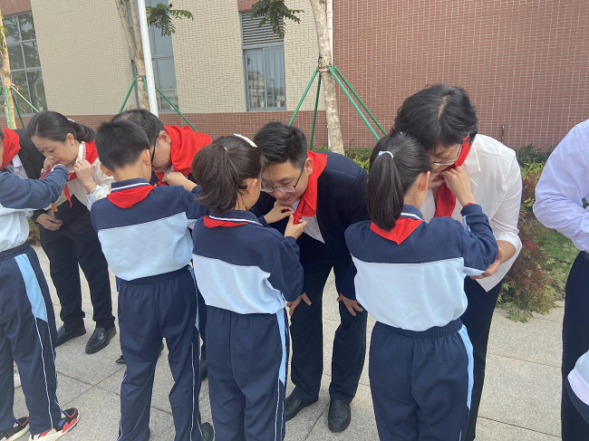 活動(dòng)伊始少先隊(duì)員們?yōu)樗屑钨e戴上了鮮艷的紅領(lǐng)巾,笑容洋溢在每一個(gè)人臉上。